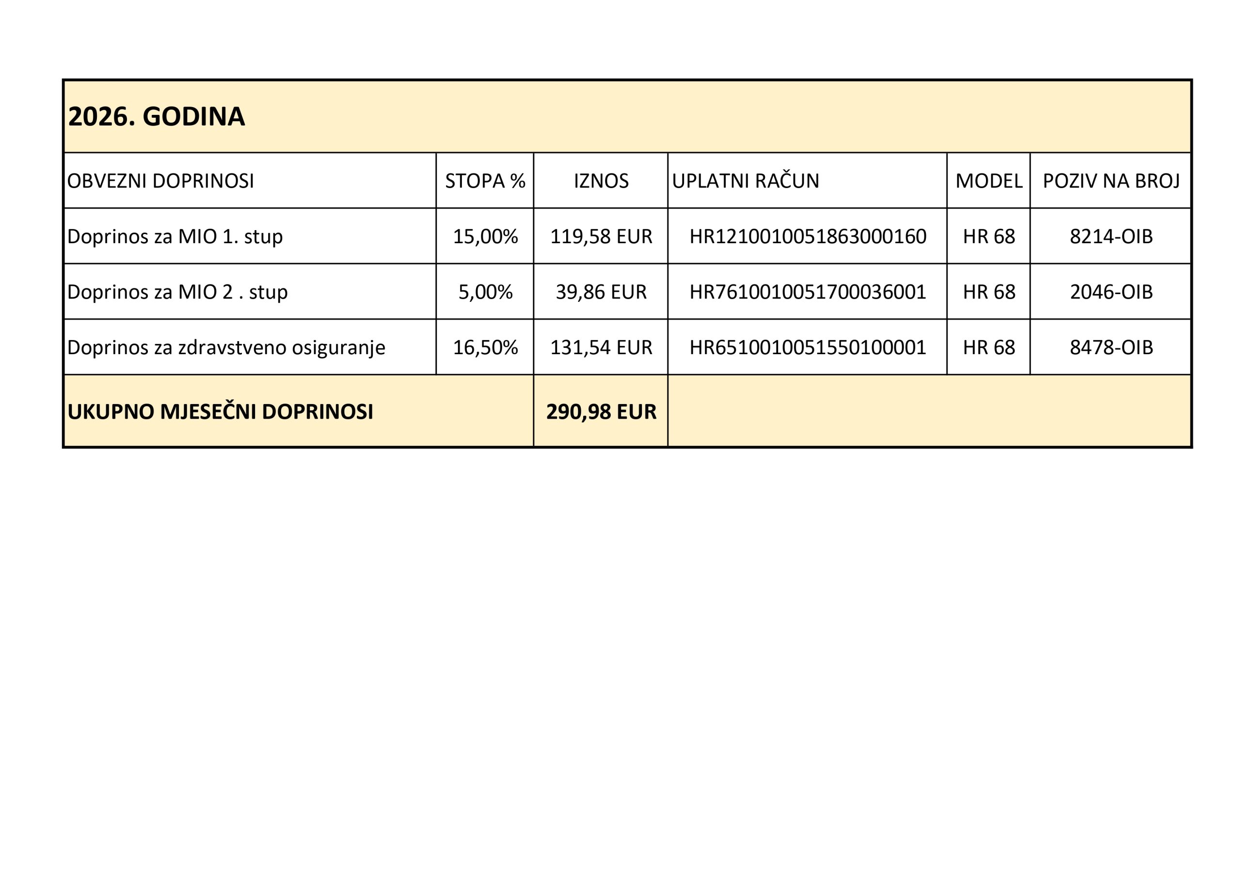 Za 2026. godinu ukupni doprinosi pojedinog obrtnika koji ima paušalno oporezivanje iznose EUR 290,98 što uključuje doprinose za mirovinsko osiguranje 1. stup, doprinose mirovinsko osiguranje 2. stup i zdravstveno osiguranje.